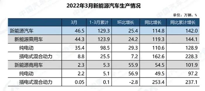 從新能源汽車產(chǎn)業(yè)的產(chǎn)銷數(shù)據(jù)來(lái)看,2022年3月,新能源汽車生產(chǎn)完成46.5萬(wàn)輛,同比增長(zhǎng)1.15倍。其中純電動(dòng)乘用車生產(chǎn)35.4萬(wàn)輛,同比增長(zhǎng)110.6%;插電式混合動(dòng)力乘用車生產(chǎn)8.8萬(wàn)輛,環(huán)比增長(zhǎng)7.2%;純電動(dòng)商用車生產(chǎn)2.2萬(wàn)輛,同比增長(zhǎng)49.5%;插電式混合動(dòng)力商用車生產(chǎn)0.05萬(wàn)輛,同比增長(zhǎng)253.4%。