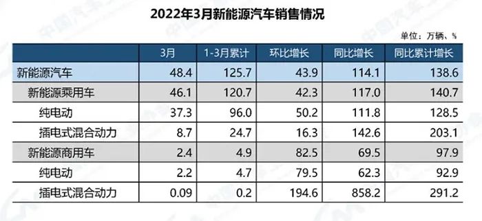 3月,新能源汽車銷售完成48.4萬(wàn)輛,同比增長(zhǎng)1.14倍。其中純電動(dòng)乘用車銷售完成37.3萬(wàn)輛,同比增長(zhǎng)111.8%;插電式混合動(dòng)力乘用車銷售完成8.7萬(wàn)輛,同比增長(zhǎng)142.6%;純電動(dòng)商用車銷售完成2.2萬(wàn)輛,同比增長(zhǎng)62.3%;插電式混合動(dòng)力商用車銷售完成0.09萬(wàn)輛,同比增長(zhǎng)858.2%。