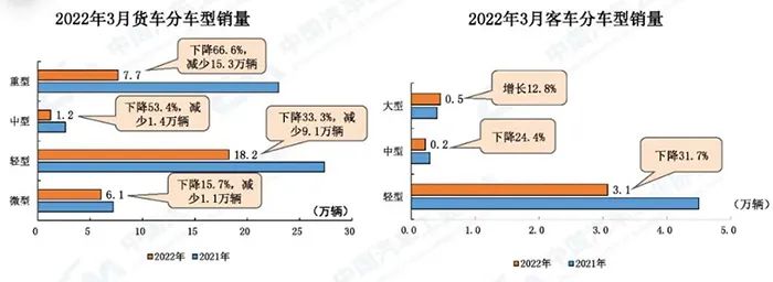 從細(xì)分車型來(lái)看,2022年3月,商用車產(chǎn)銷分別完成36萬(wàn)輛和37萬(wàn)輛,同比分別下降38%和43.5%。其中,3月重型貨車銷7.7萬(wàn)輛,中型貨車銷1.2萬(wàn)輛,輕型貨車銷18.2萬(wàn)輛,微型貨車銷6.1萬(wàn)輛。四類貨車同比呈不同程度下降,重型貨車降幅最為明顯,同比下降66.6%。