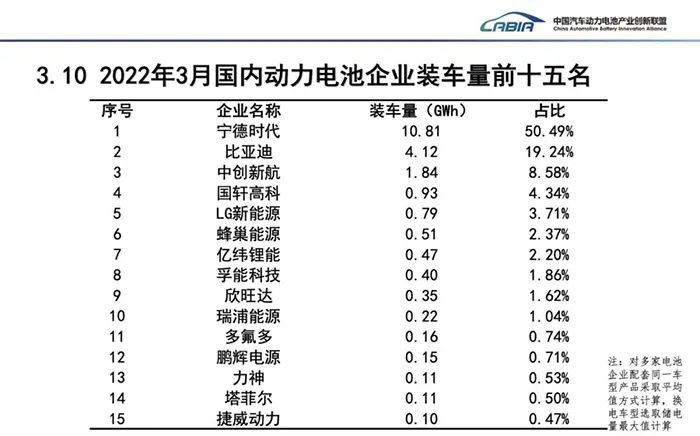 2022年1-3月國(guó)內(nèi)動(dòng)力電池企業(yè)裝車量前十名分別是:寧德時(shí)代、比亞迪、中創(chuàng)新航、國(guó)軒高科、蜂巢能源、LG能源、億緯鋰能、孚能科技、欣旺達(dá)、捷威動(dòng)力。