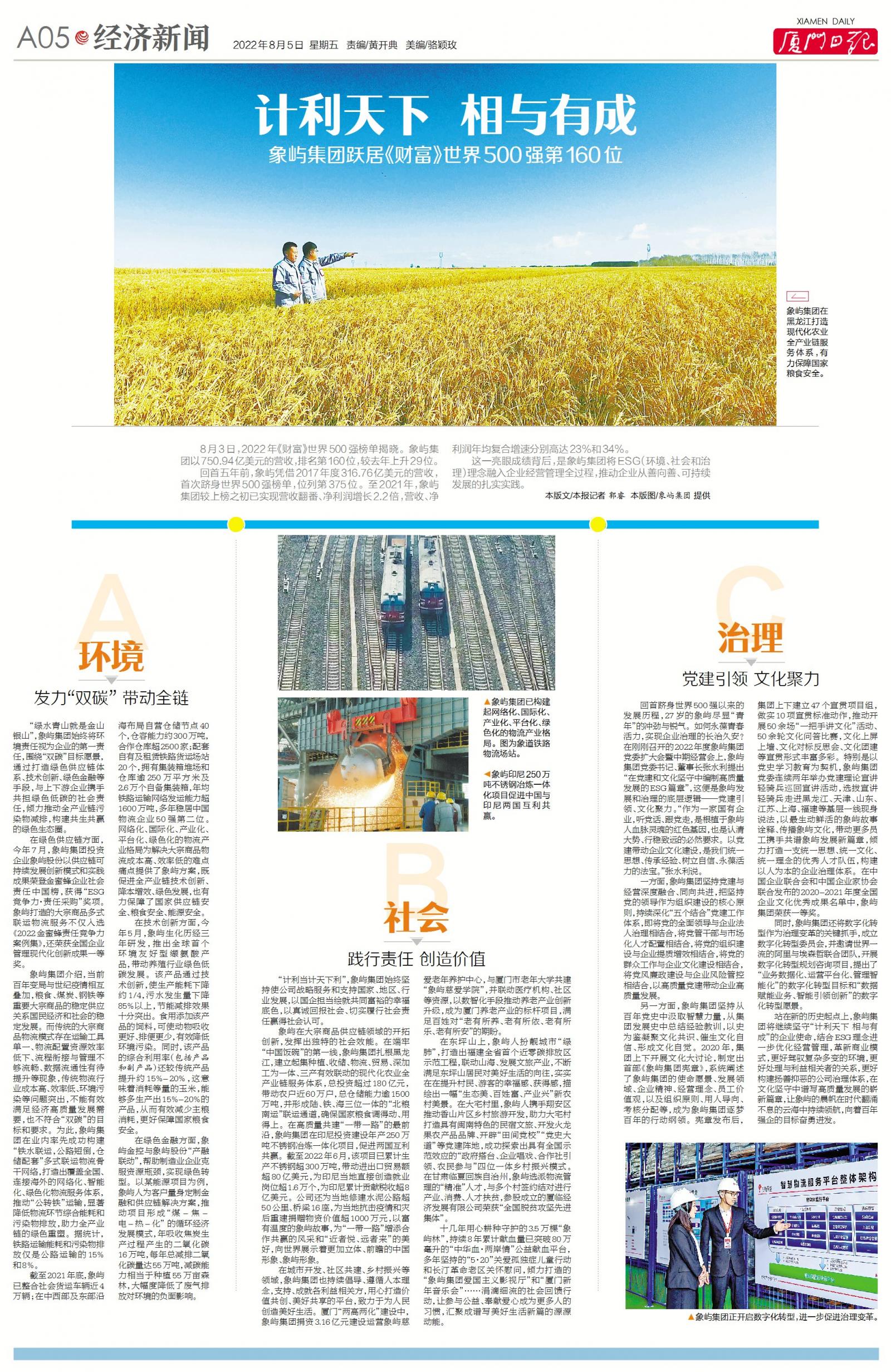 8月3日,2022年《財富》世界500強榜單揭曉。象嶼集團以750.94億美元的營收,排名第160位,較去年上升29位。