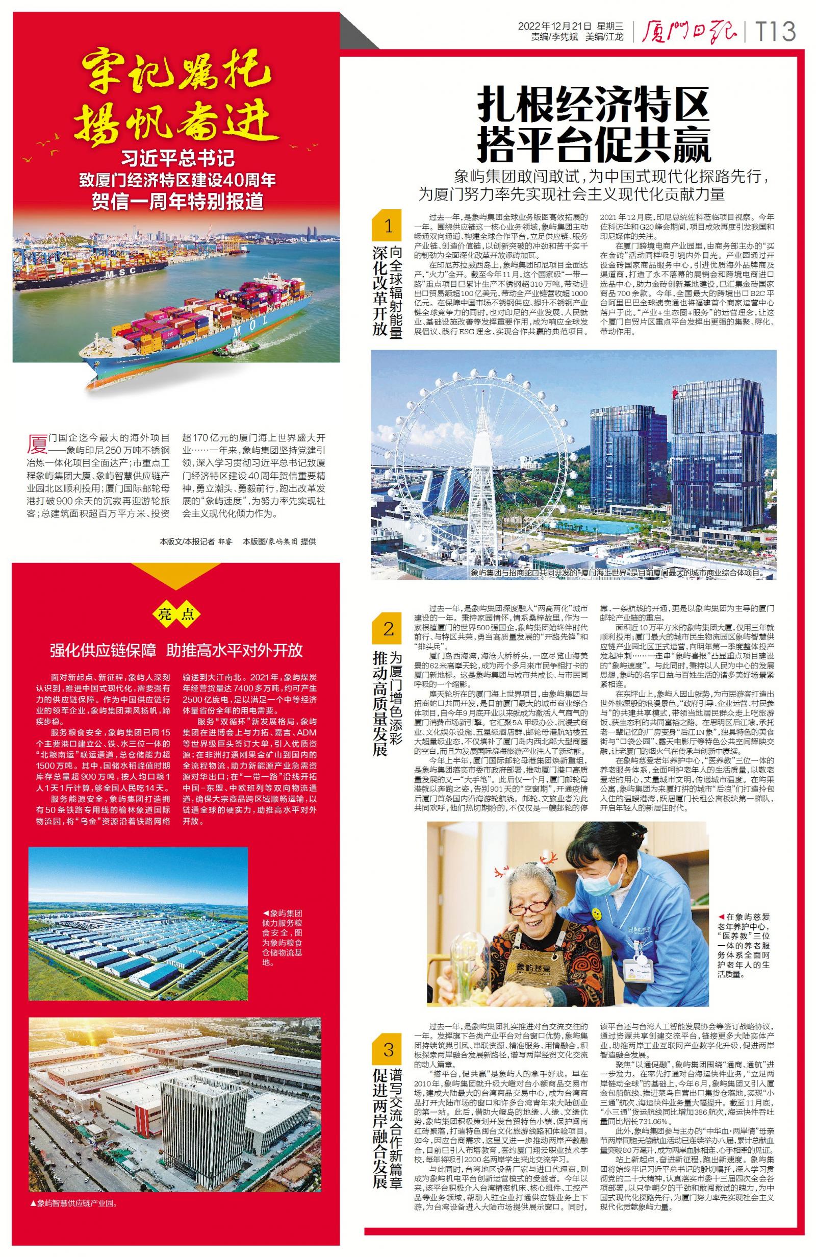 廈門國(guó)企迄今最大的海外項(xiàng)目——象嶼印尼250萬(wàn)噸不銹鋼冶煉一體化項(xiàng)目全面達(dá)產(chǎn);市重點(diǎn)工程象嶼集團(tuán)大廈、象嶼智慧供應(yīng)鏈產(chǎn)業(yè)園北區(qū)順利投用;廈門國(guó)際郵輪母港打破900余天的沉寂再迎游輪旅客;總建筑面積超百萬(wàn)方、投資超170億元的廈門海上世界盛大開(kāi)業(yè)……一年來(lái),象嶼集團(tuán)堅(jiān)持黨建引領(lǐng),深入學(xué)習(xí)貫徹習(xí)近平總書(shū)記致廈門經(jīng)濟(jì)特區(qū)建設(shè)40周年賀信重要精神,勇立潮頭、勇毅前行,跑出改革發(fā)展的“象嶼速度”,為努力率先實(shí)現(xiàn)社會(huì)主義現(xiàn)代化傾力作為。今天,廈門日?qǐng)?bào)推出特刊《牢記囑托 揚(yáng)帆奮進(jìn) 習(xí)近平總書(shū)記致廈門經(jīng)濟(jì)特區(qū)建設(shè)40周年賀信一周年特別報(bào)道》,現(xiàn)全文轉(zhuǎn)載如下。