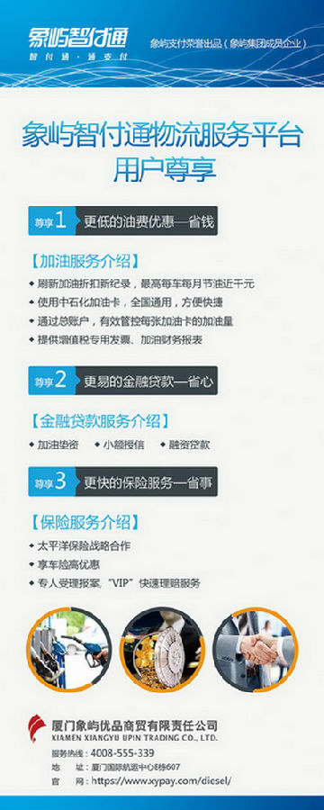 目前,通過與中石化森美、太平洋保險的深度戰(zhàn)略合作,象嶼智付通物流服務(wù)平臺已在貨運(yùn)加油、貨運(yùn)保險領(lǐng)域為中小貨運(yùn)企業(yè)爭取到行業(yè)領(lǐng)先企業(yè)才能享受的更誘人的價格、更便捷的服務(wù)和更安全的保障。同時,針對貨運(yùn)企業(yè)普遍存在的資金周轉(zhuǎn)難題,整合象嶼在金融與互聯(lián)網(wǎng)領(lǐng)域的優(yōu)勢資源,積極搶灘貨運(yùn)金融市場先機(jī)。后續(xù),象嶼智付通物流服務(wù)平臺將通過不斷收集客戶意見,不斷滿足市場迫切需求,不斷測試、優(yōu)化平臺服務(wù)流程,全面整合貨運(yùn)后市場相關(guān)的車輛維護(hù)、購買、通行、檢查、信息服務(wù)等一系列配套服務(wù),全面進(jìn)軍以搶占這一領(lǐng)域的發(fā)展先機(jī)。