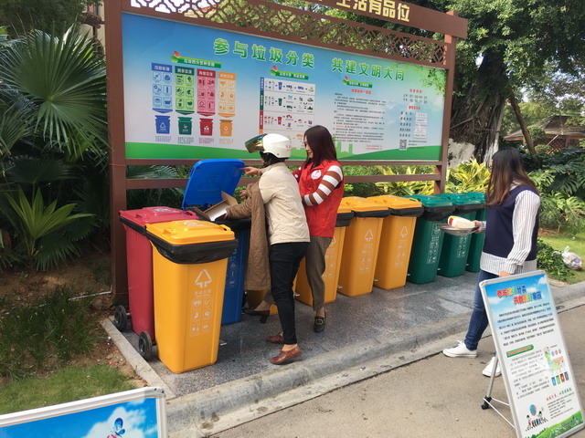 ▲廈門新為天企業(yè)管理有限公司象嶼分公司組織員工利用周末、晚上等時間在社區(qū)垃圾收集點做志愿督導(dǎo)員,用行動倡議垃圾分類。