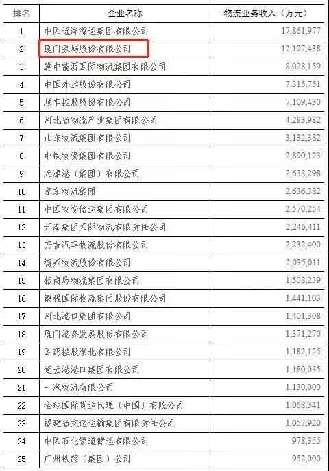 11月23日,中國物流與采購聯(lián)合會公布了2018年度中國物流企業(yè)50強排名,象嶼股份躍居第2,較上一年前進兩位。