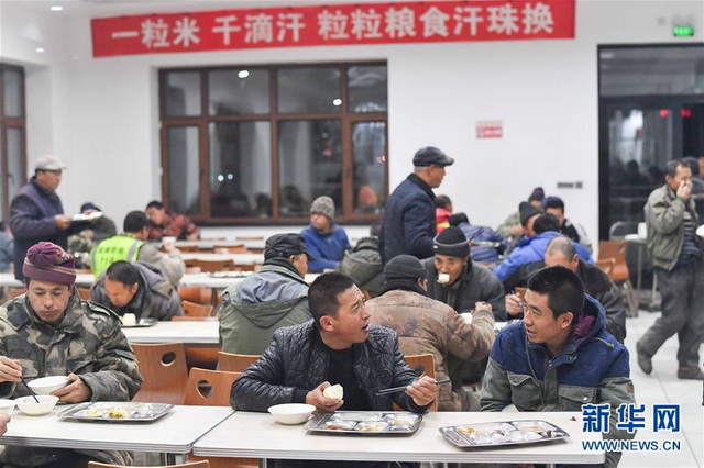 在黑龍江北安市的北安象嶼金谷農(nóng)產(chǎn)有限責(zé)任公司免費(fèi)餐廳中,糧農(nóng)們邊用晚餐邊等待過磅、卸糧、結(jié)算