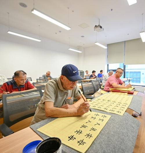 在廈門(mén)象嶼慈愛(ài)老年養(yǎng)護(hù)中心的書(shū)畫(huà)室里,長(zhǎng)者們正在老師的耐心教授下用心練毛筆字。他們中,既有入住養(yǎng)護(hù)中心的長(zhǎng)者,也有來(lái)自周邊社區(qū)的退休老人。
