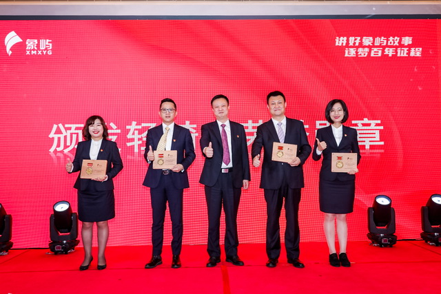 ▲象嶼集團黨委副書記、工會主席邵蕰默為宣講人授予“象嶼集團黨建理論宣講輕騎兵勛章”
