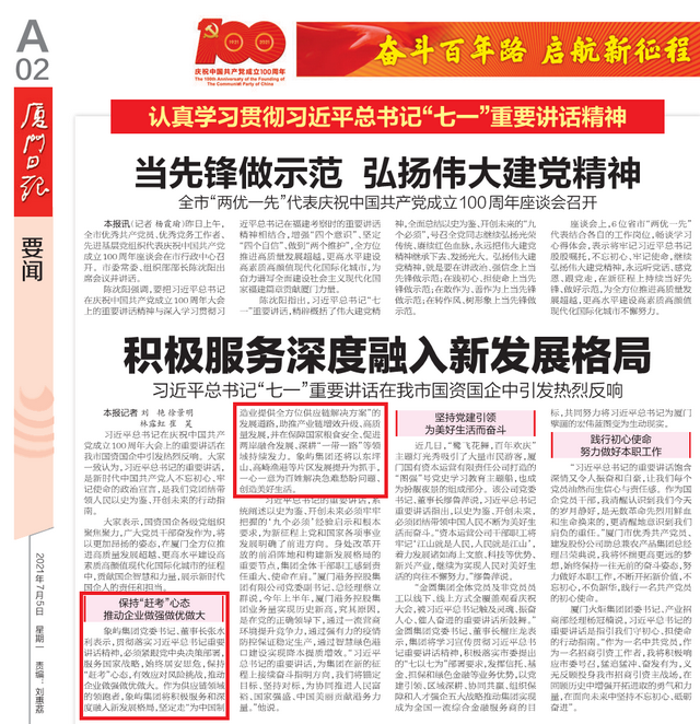 7月5日,《廈門日報》以《積極服務(wù)深度融入新發(fā)展格局》為題,報道我市國資國企系統(tǒng)學(xué)習(xí)貫徹情況,突出報道了象嶼集團(tuán)黨委書記、董事長張水利的學(xué)習(xí)心得。