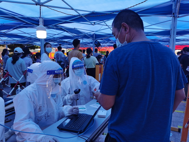 象嶼地產(chǎn)黨員志愿者王任卿,則在自己的防護服正面,寫上了“廈門必勝”四個大字,將信心傳遞給每一位來檢測的市民。他說:“防護服隔離了病毒卻鎖住了汗水,手被汗水泡皺,衣服沾在身上動彈不得。雖然悶熱、笨重,心中卻是滿滿的自豪感。戰(zhàn)疫有我,廈門必勝!”