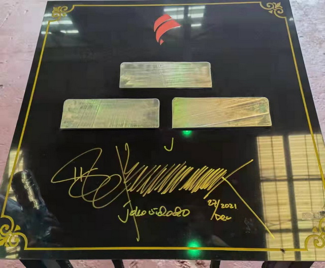 佐科參觀園區(qū)內(nèi)的象嶼印尼250萬(wàn)噸不銹鋼一體化冶煉項(xiàng)目(以下簡(jiǎn)稱象嶼印尼項(xiàng)目),并在鑲有公司產(chǎn)品(不銹鋼坯)的石牌上簽字留念。