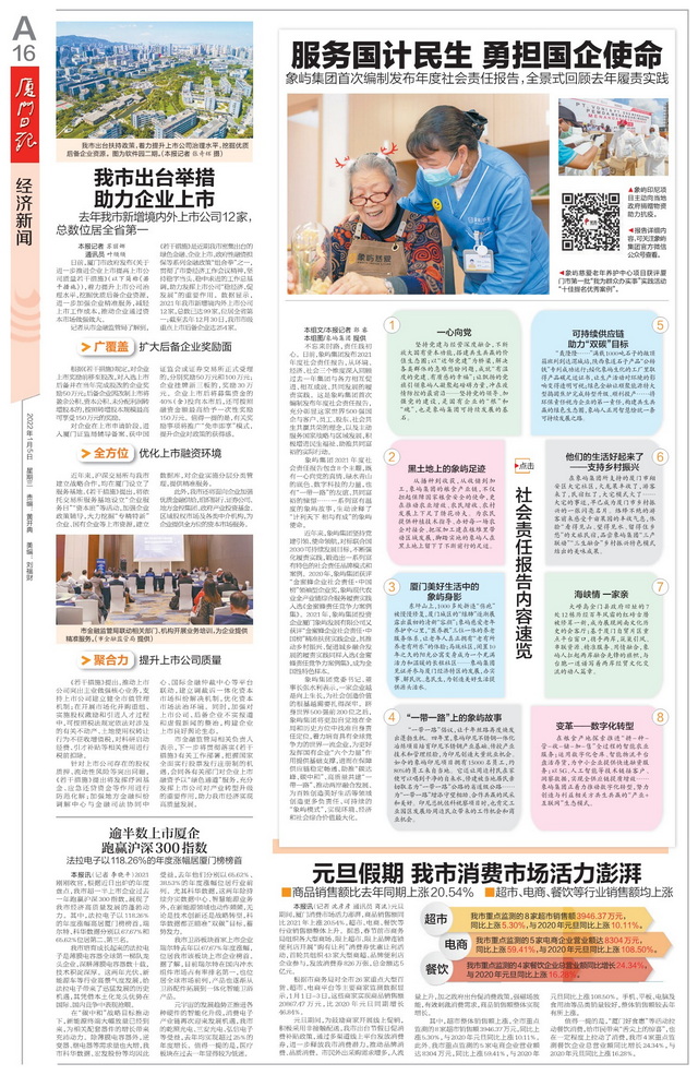 【廈門日?qǐng)?bào)】服務(wù)國(guó)計(jì)民生 勇?lián)鷩?guó)企使命——象嶼集團(tuán)首次編制發(fā)布年度社會(huì)責(zé)任報(bào)告,全景式呈現(xiàn)2021年履責(zé)實(shí)踐