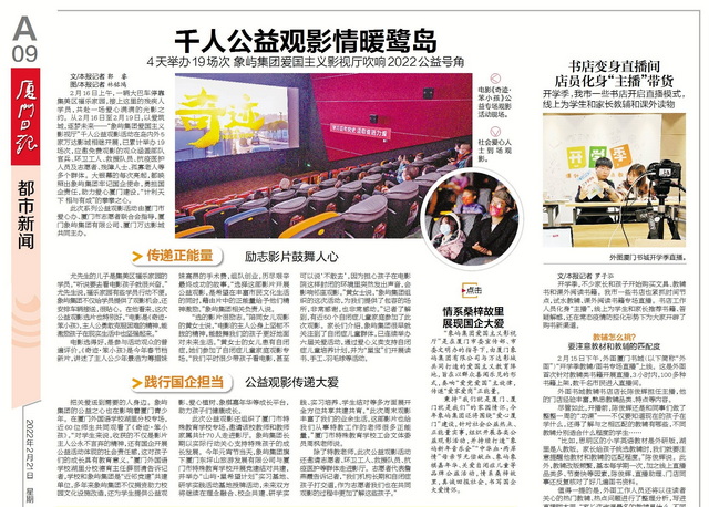 把關(guān)愛送到需要的人身邊。象嶼集團的公益之心也在影響著廈門青少年。在廈門外國語學校湖里分校專場,近60位師生共同觀看了《奇跡·笨小孩》。“對學生來說,收獲的不僅是影片主人公永不言棄的精神,還有國企開展公益活動體現(xiàn)的社會責任感。象嶼集團的擔當精神對孩子們的成長具有教育意義。”廈門外國語學校湖里分校德育主任薛麗清告訴記者,學校和象嶼集團是“近鄰黨建”共建單位,多年來象嶼集團不僅捐資助力校園文化設(shè)施改造,還為學生提供公益觀影、愛心植樹、象棋嘉年華等成長平臺,助力孩子們健康成長。